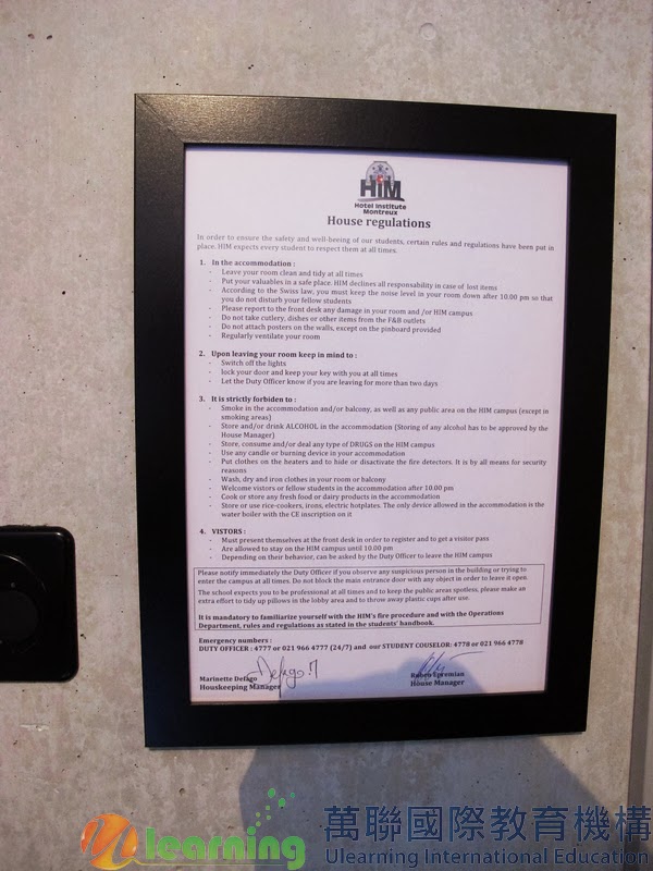 入住時,學生最好將每條住宿規定(見左圖)看清楚,並遵守其規定,以免發生任何問題而怪罪校方沒好好照顧或提醒你!比如:讓自己的房間永保整齊清潔;將貴重物品放置於安全處所,倘若遺失,HIM不付任何責任。離開房門前要關燈,鎖上房門,鑰匙不離身……等。一個人隻身在外,在異鄉念書固然辛苦,但也要隨時留意自己人身與財物安全,學校規定雖是一個規範,也是一個重要的叮嚀與提醒。務必要配合學校的規定,這樣才能讓自己的校園生活過得既順利又快樂!