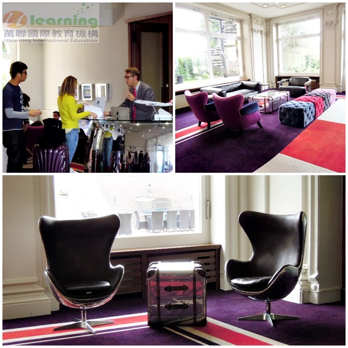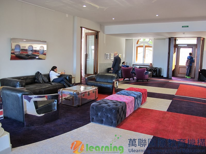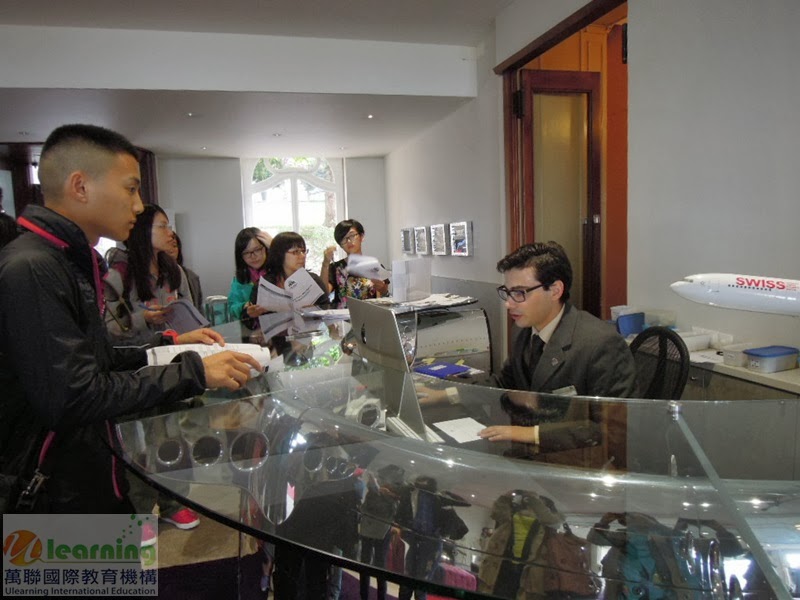 接待處有兩個,大的為主要接待處,也是櫃台值班經理所在之處;小的為協助主要接待處處理事情的地方。比如我們當天抵達時有位學生他的手機遺落在蘇黎世機場的安檢處,當時由於轉機至日內瓦行程太趕,故而無法當場在機場返回安檢處尋找,機場人員說到日內瓦機場再去失物招領處登記,但據學生表示該處似乎不太積極處理,所以當我們抵達學校後,先直接找主要接待處的人員請求協助,那位神似超人的帥哥太忙,值班經理要我們去找旁邊那位超熱血的接待小姐。她立刻拿起手機打電話到蘇黎世機場,協助學生詢問,雖然後來手機找不回來了,但讓我們對HIM櫃檯接待員的積極處理事情態度留下深刻印象!