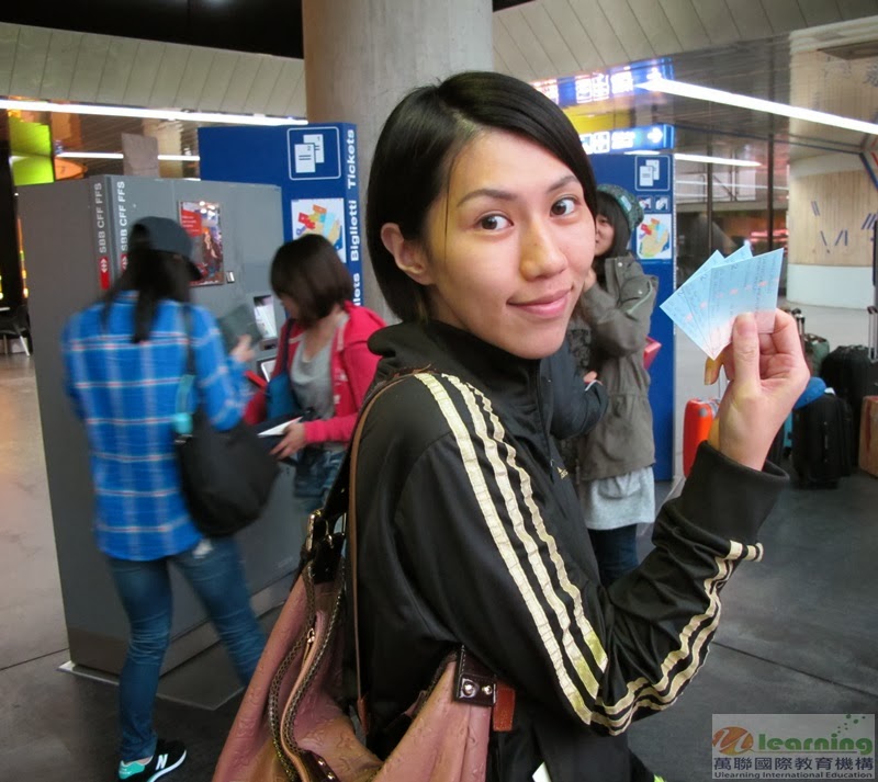 首先,學生們必須學會如何利用購票機買火車票,由茶非小姐親自示範,一個步驟一個步驟詳細講解。戴絲看到這般情景很是感動!茶非小姐不顧自身長途旅程的疲累,以及身負領著一行30餘人(含顧問與學生)「HIM留學團」的工作壓力,仍能這麼細心與耐心,臉上永遠掛著甜美笑容面對學生。戴絲心想,瑞士國鐵公司(SBB)應該聘請這位永遠充滿工作熱誠又美麗的茶非小姐擔任台灣區的代言人才是啊!一群學生圍繞在茶非小姐身旁認真地學著,另一群學生已迫不急待地在另一台機器躍躍欲試。